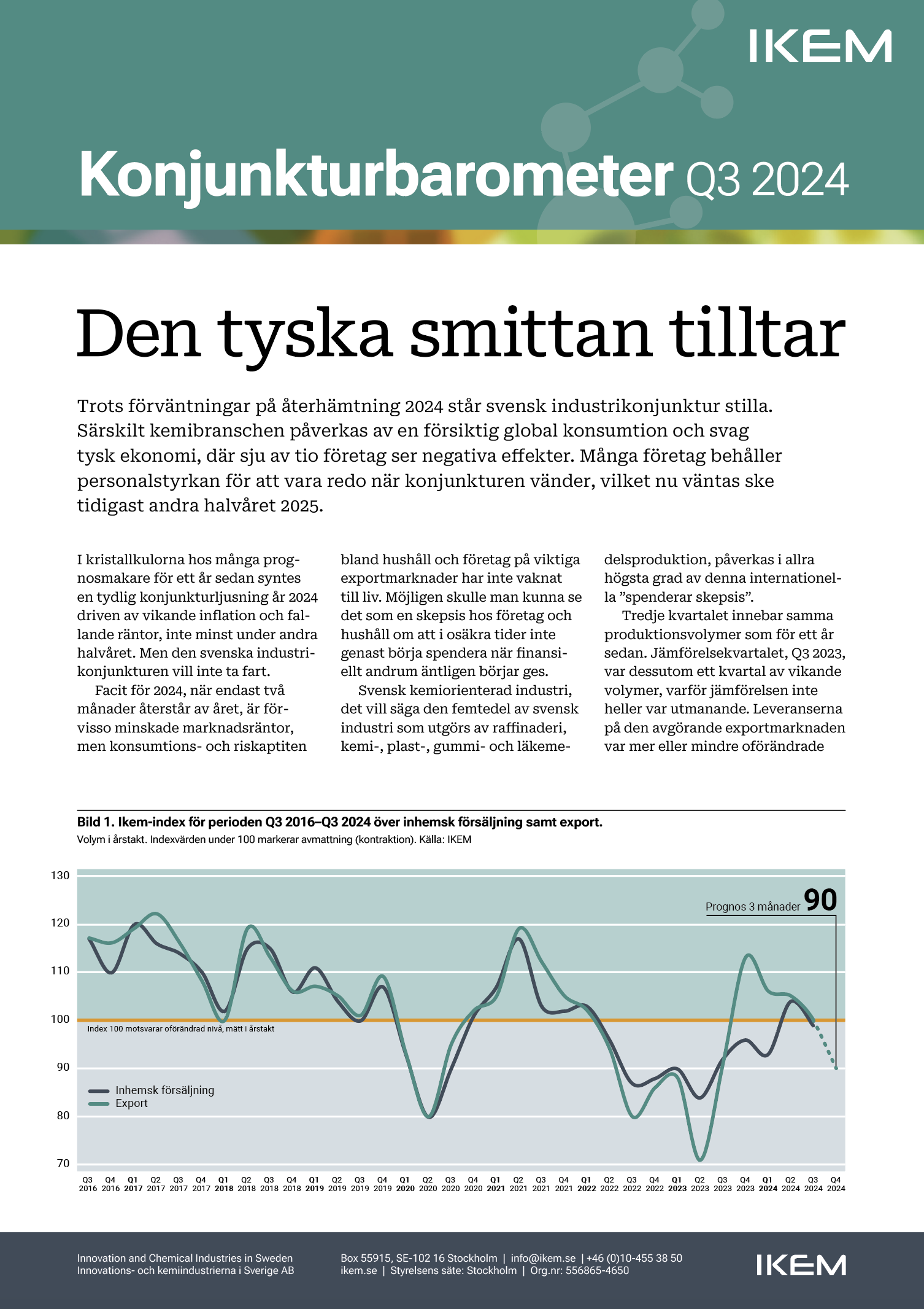 Q3 2024: Den tyska smittan tilltar IKEM, november 2024. Ladda ner IKEM:s Konjukturbarometer Q3 2024: Den tyska smittan tilltar PDF • 07 feb. 2024 Vår industri Fakta och statistik om våra branscher ✖ Innovationer för framtiden ✖ IKEM:s konjunkturbarometer Prenumerera på Konjunkturbarometern ✖ Arkiv: Konjunkturbarometern ✖ ✖