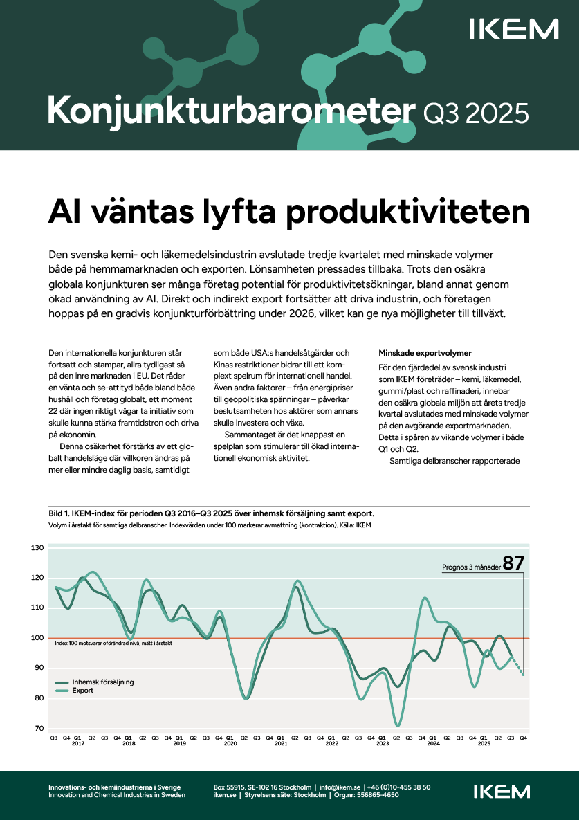 Q3 2025: AI väntas lyfta produktiviteten IKEM, november 2025. Ladda ner IKEM:s Konjukturbarometer Q3 2025: AI väntas lyfta produktiviteten PDF • 06 nov. 2025 Vår industri Fakta och statistik om våra branscher ✖ Innovationer för framtiden ✖ IKEM:s konjunkturbarometer Prenumerera på Konjunkturbarometern ✖ Arkiv: Konjunkturbarometern ✖ ✖
