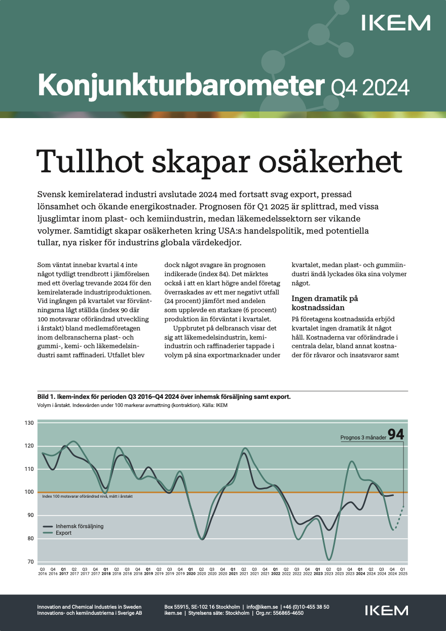 Q4 2024: Tullhot skapar osäkerhet IKEM, februari 2025. Ladda ner IKEM:s Konjukturbarometer Q4 2024: Tullhot skapar osäkerhet PDF • 17 feb. 2025 Vår industri Fakta och statistik om våra branscher ✖ Innovationer för framtiden ✖ IKEM:s konjunkturbarometer Prenumerera på Konjunkturbarometern ✖ Arkiv: Konjunkturbarometern ✖ ✖